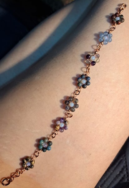 This cute daisy chain anklet takes you back to the 90's is the best way imaginable. Each daisy is made from a different natural stone all the way around.